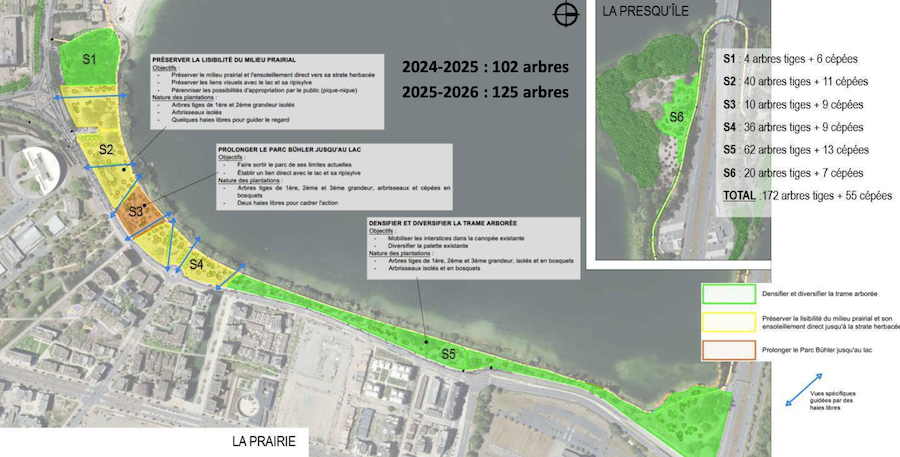 Le projet prévoit également d'étendre le parc Bühler au-delà de ses limites actuelles, en le prolongeant jusqu'aux abords du lac. Cette extension vise à créer une transition harmonieuse entre le parc et la zone boisée qui encercle le lac. Pour renforcer cette continuité naturelle, 19 arbres de différentes tailles, ainsi que des bosquets d'arbustes, seront plantés, apportant à la fois diversité végétale et ombrage, tout en favorisant la biodiversité locale.