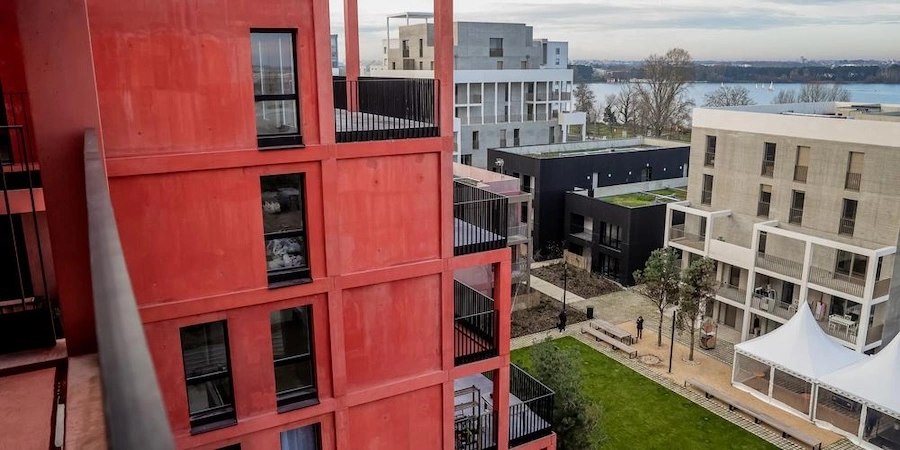Le début d’un quartier imposant. Les tout premiers 199 logements de l’îlot 4 de la résidence Noème, située en bordure du lac de Bordeaux et à quelques minutes du stade Matmut-Atlantique, ont été inaugurés vendredi 13 décembre. « Il manquait un quartier entre Ginko et le lac, avec Noème c’est chose faite », se félicite Julien Drouaud, directeur du pôle résidentiel de Covivio, l’opérateur immobilier du projet. Cet îlot est composé de 11 bâtiments de diverses tailles, allant de la bâtisse à deux étages à la façade en bois brûlé, aux hauts immeubles en R + 8 en béton couleur terracotta. « Quatre agences d’architectures ont travaillé en atelier afin d’avoir autant de continuité que de diversité architecturale », explique Julien Drouaud. « L’épannelage a été fait de telle sorte pour qu’il y ait une véritable percée vers le lac. »