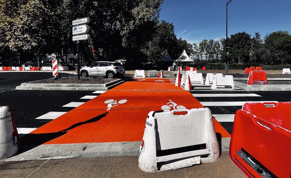 Les travaux ont débuté discrètement en mars 2024 et leurs effets se voient déjà dans le secteur nord, entre Bruges, Les Aubiers et Ginko. Entre les deux variantes du projet — la version « Minimaliste » et la version « Ambitieuse » — présentées lors de la concertation, la Métropole et la Ville ont finalement choisi la seconde. Près de 2.500 m² de sols, soit la surface maximale possible, ont ainsi été récupérés et désimperméabilisés, sur des espaces autrefois occupés par la voirie et l’ancien rond-point. Une voie de circulation a été transformée en piste cyclable en site propre, tandis que la bretelle ouest de l’allée, côté Bruges, est appelée à disparaître.