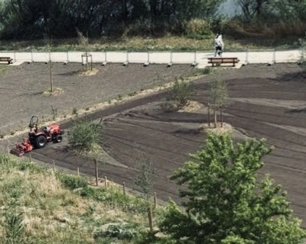 « Il s’agit du chantier de semis du gazon sur les zones non polluées. Le semis débutera mercredi prochain [18/06] par hydroseeding : une projection sur le sol, à l’aide d’un canon, d’un mélange liquide appelé hydromulch, composé de graines, d’eau, d’amendements et d’un liant. Le sol prendra alors une teinte bleutée » , explique Anne-Charlotte Riedel, secrétaire générale du quartier Bordeaux Maritime.